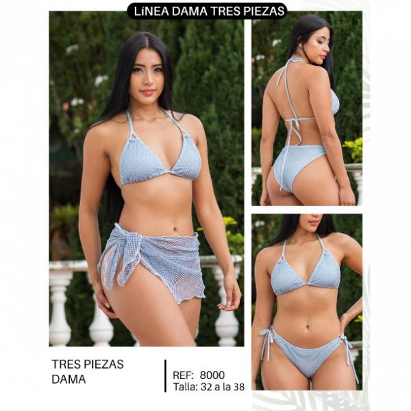 Kit completo de tres piezas en tono azul cielo, con un hermoso tejido que incluye bikini y pareo. Estilo y cobertura sofisticada para la playa. REF: 8000. Tallas: 32 a la 38.