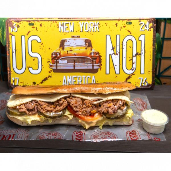 ¡Delicioso Sandwich Cubano! con Pan artesanal, Carne desmechada, queso mozzarella, salsas, lechuga, tomate, pepinillos y salsa de ajo de la casa.