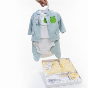 Adorable conjunto en tono aqua con un simpático diseño de rana. Ideal para la comodidad diaria de tu bebé. Incluye chaqueta, body, pantalón con pie y babero. El precio depende de la talla.