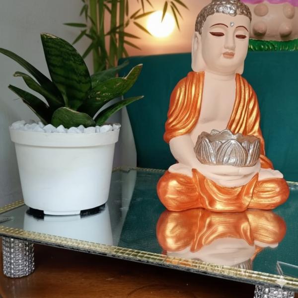 Crea un ambiente de calma con este elegante Buda dorado, ideal como portavela y acompañado de una planta natural para un toque de serenidad. Perfecto para meditar y decorar.