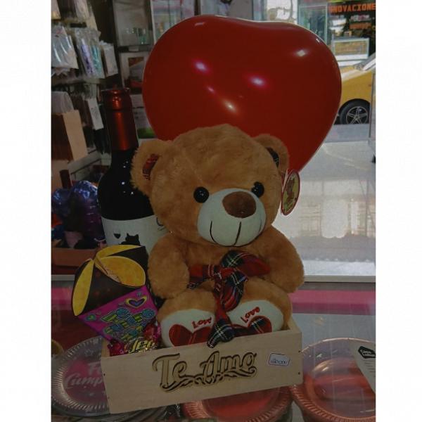 Ancheta personalizada que incluye vino, peluche, globo y dulces, perfecta para sorprender en cualquier ocasión. Celebra tus fechas especiales con Papelería Alta Pinta, adaptamos cada detalle a tus gustos y necesidades.