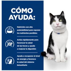 Para gatos con problemas digestivos, Hill's ofrece la línea Prescription Diet i/d Digestive Care y Prescription Diet Gastrointestinal Biome. Estos son alimentos de fórmula veterinaria diseñados para ayudar a manejar trastornos gastrointestinales y deben usarse bajo la supervisión de un veterinario