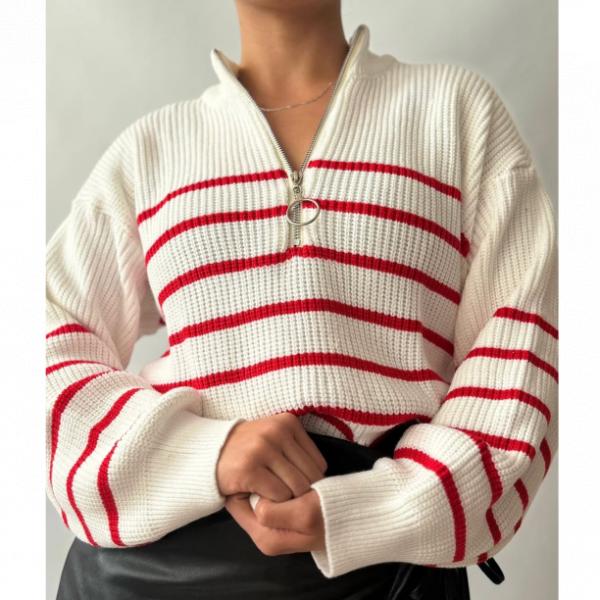 Suéter de punto grueso en color blanco con rayas horizontales, que evoca un clásico estilo náutico y preppy. Con un moderno cuello alto y media cremallera, es la prenda perfecta para un look deportivo, cómodo y muy a la moda.