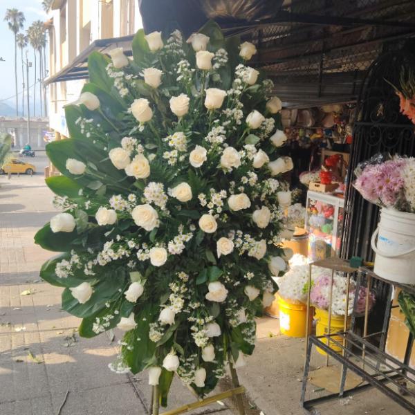 Un imponente arreglo de Rosas blancas que transmiten el mensaje atemporal de pureza, paz y profunda reverencia. Un tributo de belleza serena y respeto. Este arreglo puede ser personalizado en tamaño, tipo de flor y colores. El precio final depende de las necesidades y especificaciones del cliente.