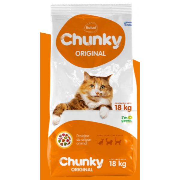 El alimento Chunky Cat para gatos adultos, en presentación de 18 kg, se caracteriza por ser un concentrado de alta proteína hecho con carne real de pollo, salmón y cordero, diseñado para una nutrición completa y balanceada
