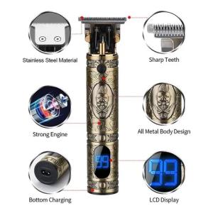 Máquina de corte inalámbrica con cuerpo metálico tallado y pantalla LCD. Cuenta con cuchillas de acero inoxidable tipo T para cortes precisos y una batería de litio de larga duración (hasta 300 minutos).