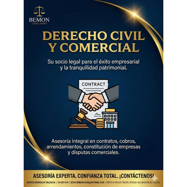 Asesoría y representación experta en contratos, cobro de carteras, arrendamientos, constitución de empresas y disputas comerciales. El precio varía dependiendo del tipo de trámite (ej. demanda o contrato) y la cuantía de la pretensión.