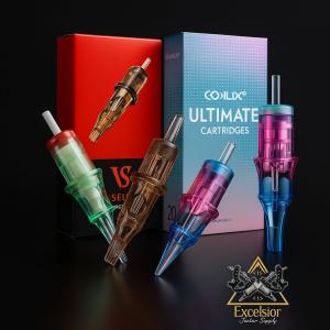 Cartucho de agujas para tatuar en configuraciones RL, RS, RM y M1 fabricado en acero quirúrgico y plástico grado médico, disponible en calibres #06–#12 (0.20–0.35 mm) que indican el grosor de cada aguja individual. RL (round liner) para líneas, RS (round shader) para sombreado, M1 (magnum) y RM (round magnum) para relleno. Agrupaciones comunes: RL 1–18, RS 3–18, M1/RM 5–27 agujas