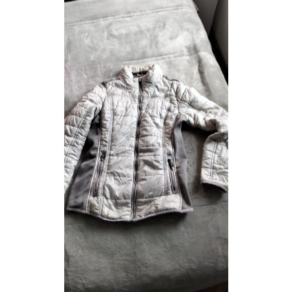 Chaqueta de color crema o blanco hueso con diseño acolchado horizontal. Cuenta con paneles laterales en tela elástica gris para un mejor ajuste, bolsillos con cremallera y un cuello alto protector.