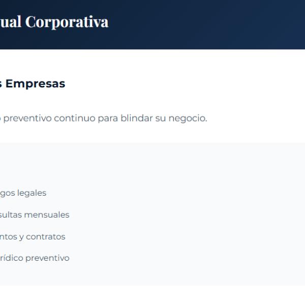 (Plan para Pequeñas Empresas) Servicio de acompañamiento jurídico preventivo continuo diseñado para proteger y fortalecer su negocio. Incluye optimización de riesgos legales, hasta cuatro consultas mensuales, revisión de documentos y contratos, y asesoría estratégica permanente para garantizar decisiones seguras y cumplimiento normativo.