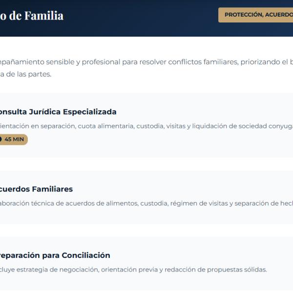 Brindamos acompañamiento sensible y profesional para resolver conflictos familiares, priorizando el bienestar y la seguridad jurídica. Incluye consulta especializada de 45 minutos en separación, cuota alimentaria, custodia, visitas y liquidación de sociedad conyugal; elaboración de acuerdos familiares y preparación estratégica para conciliación con propuestas sólidas.