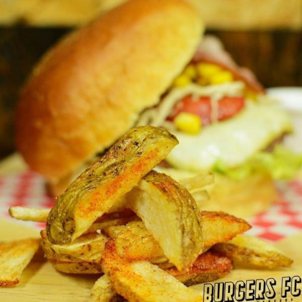pan brioche, lechuga, carne de la casa, queso, tocineta, chorizo de ternera, maíz tierno, guiso pomarola, pollo desmechado, chicharrón, pepinillo, salsas porcion de papas en casco.