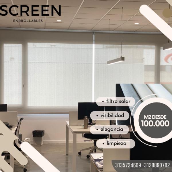 Persiana enrollable screen es un tipo de cortina que filtra la luz natural, permite ver el exterior mientras protege el interior de los rayos UV, se acciona verticalmente mediante una cadena. Su tejido microperforado está compuesto PVC y es ideal para controlar el deslumbramiento y crear ambientes luminosos y agradables en lugares como oficinas o salas. tambien epecial para terrazas ya que su resistencia al sol y al agua lo hacen ideal para este espacio