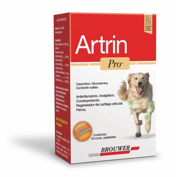 Analgésico, Antiinflamatorio, regenerador el cartílago articular. Fórmula: Carprofeno, Glucosamina Sulfato, Condroitin sulfato, Manganeso y Excipientes. Dosis: ½ comprimido (8-15 Kg); 1 comprimido (>25 Kg). Presentación: Estuche por 18 comprimidos birranurados.