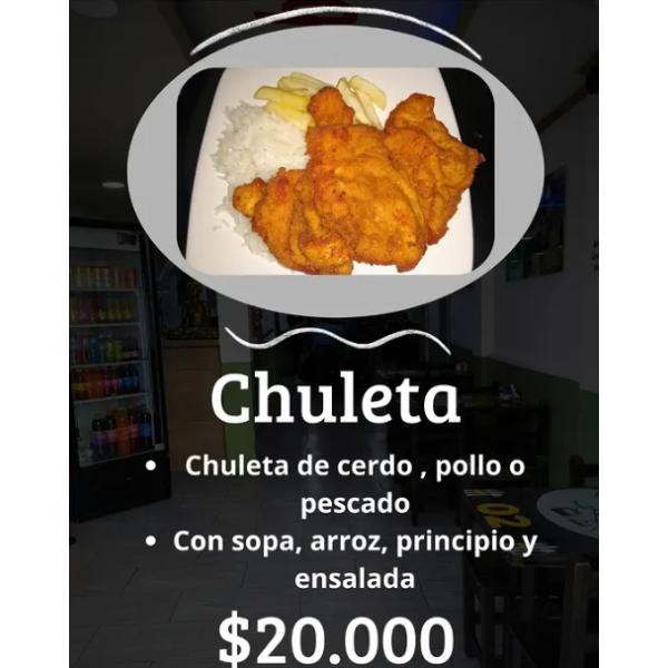 Chuleta de cerdo, pollo o pescado Con sopa, arroz, principio y ensalada