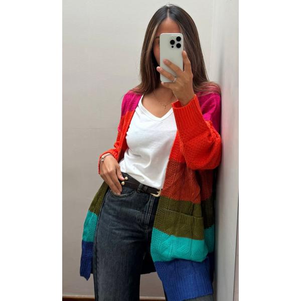 Cardigan tejido en hilo, suave y cómodo, ideal para complementar tus outfits diarios. Diseño abierto con bolsillos frontales y silueta relajada que brinda un look moderno y versátil. Destaca por sus bloques de color vibrantes que le dan un toque único y llamativo. Perfecto para usar sobre prendas básicas y elevar cualquier estilo con un aire casual y chic.