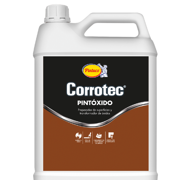 Pintóxido es un preparador químico de superficies ferrosas que actúa transformando en sales el oxido difícil de eliminar con limpieza tipo manual- mecánica. Rinde teóricamente 17,3m²/gal a 25 micrones de espesor de película seca.