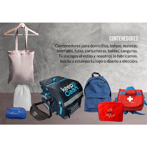 Contenedores para domicilios, bolsos, maletas, morrales, tulas, cartucheras, canguros. Tu escoges el estilo y nosotros lo fabricamos. Borda o estampa el logo de tu empresa. Regala identidad. Pide tu cotización. Te brindamos asesoría.