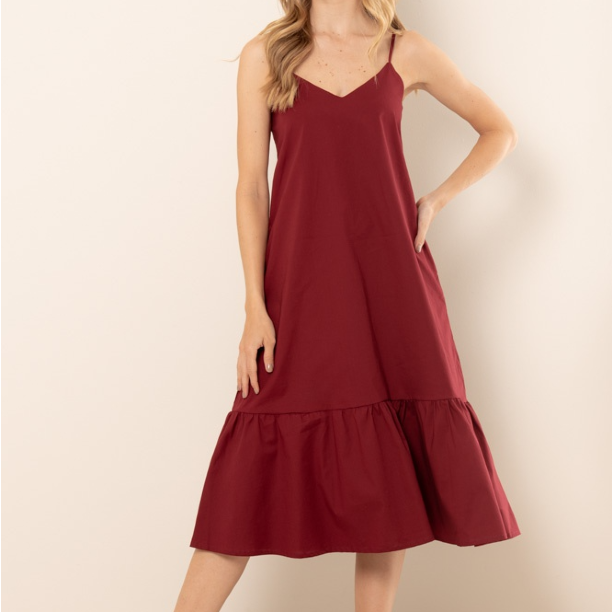 Vestido midi de tiras en popelina fondo entero, escote en V, bolero decorativo en ruedo, bolsillos laterales, silueta amplia. Color Vinotinto y negro. Tallaje XS,S,M,L,XL