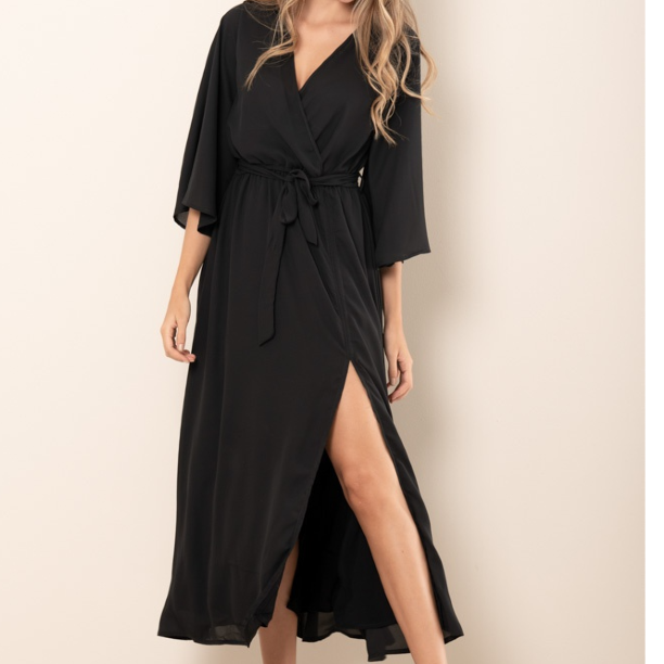 Vestido largo en chifón crepe fondo entero, escote cruzado en V, manga 3/4, detalle de cinturón en la misma tela, forro interno en chalis fondo entero. Color Negro Tallaje XS,S.M.L.XL