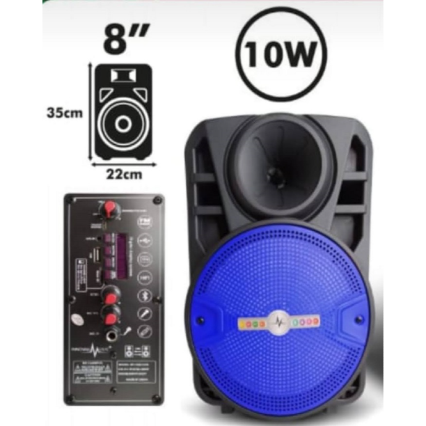 Marca: Innovall Music Modelo: Sp-112 Parlante: 8 " Bluetooth Batería recargable 1800 mah Radio FM Lector Memoria USB Lector Memoria Micro SD (TF Card) Potencia: 10W Alimentación: DC 5V Entrada para Micrófono Micrófono alámbrico incluido Función Karaoke (Control de volumen independiente para el micrófono y eco) Luces Led Control remoto Función TWS para emparejar dos al mismo tiempo.