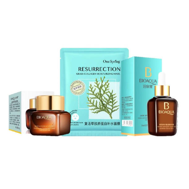 KIT REPARACIÓN FACIAL Compra nuestro serum antiedad GINSENG BIOAQUA y nuestra CREMA CONTORNO DE OJOS Y REPARACIÓN BIOAQUA y lleva totalmente gratis una MASCARILLA HIDRATANTE DE COLÁGENO DE HIERBA 1.CREMA CONTORNO DE OJOS BIOAQUA: A base de Ingredientes Naturales es una crema hidratante que te ayuda a desvanecer las manchas oscuras que están en el contorno de tus ojos y a disminuir las bolsas y los puntos de pigmentación que van apareciendo por la edad.