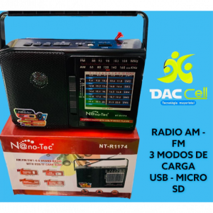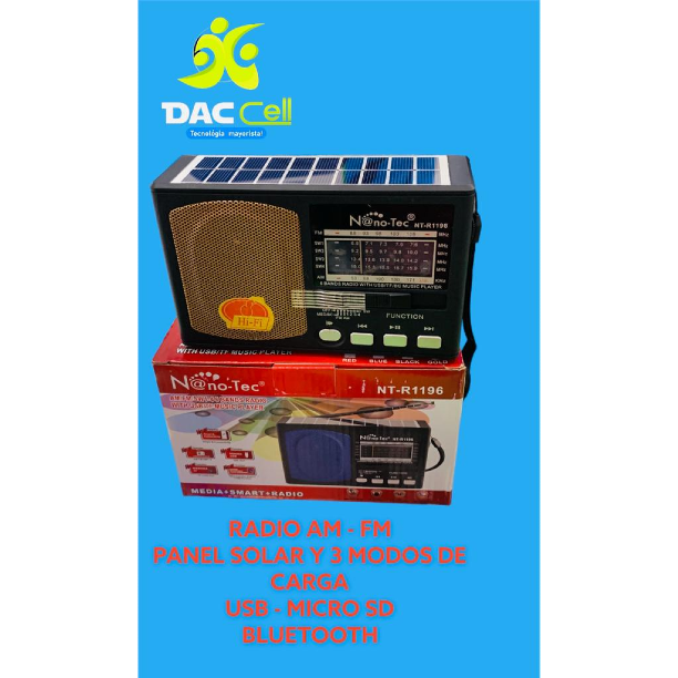 Radio AM, FM, panel solar, 3 modos de carga, USB, micro SD, Bluetooth.