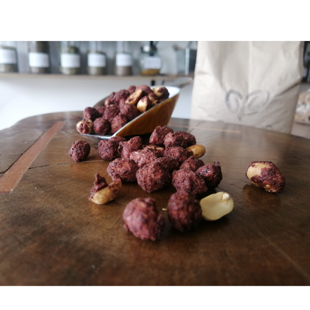 Maní confitado, sabor a chocolate y a café. precio de referencia por 10 gr. $400. De venta a granel, el pecio depende del peso.