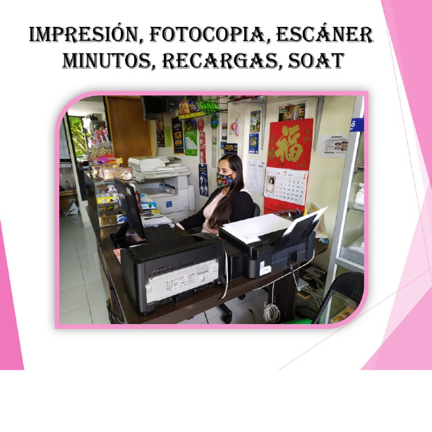 Servicios de impresion, fotocopias, recargas, minutos, llamadas intenacionales, soporte tecnico de computadores, entre otros.
