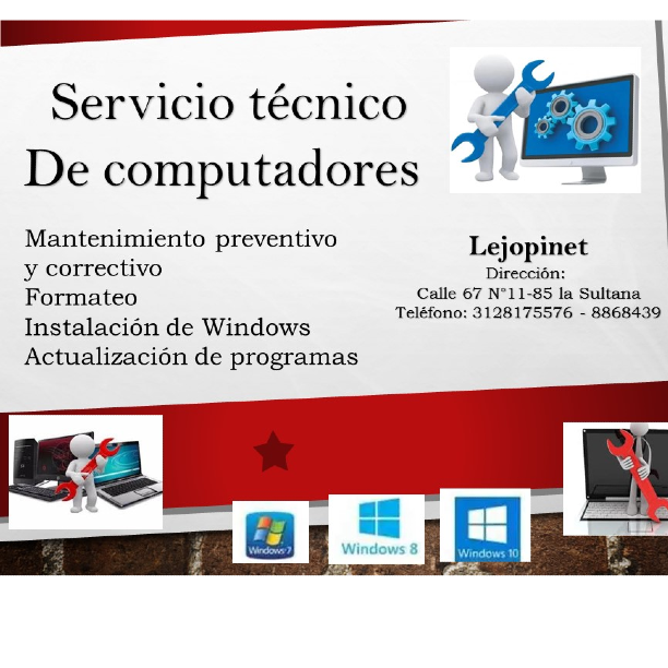 Mantenimiento y reparacion de computadores, actualizacion de programas, instalacion de windows.