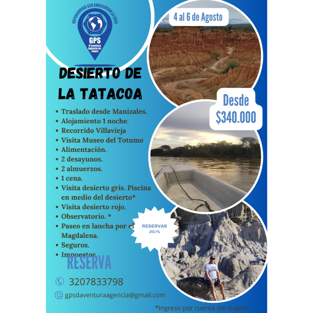Desierto de la tatacoa , una experiencia para grandes y chicos,caminata por los desiertos gris y rojo llamado Cuzco, el maravilloso observatorio astronómico y mirar las diferentes constelaciones, bañar en la piscina en medio del desierto, caminata por las calles centenarias de villa vieja, paseo en lancha por el rio magdalena , conocer de historia en el museo del totumo