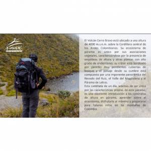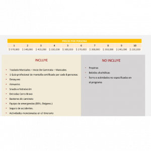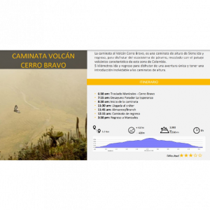 Caminata Volcán Cerro Bravo 1 Día • 6:30 am: Traslado Manizales - Cerro Bravo • 7:15 am: Desayuno Parador La Esperanza • 8:30 am: Inicio de la caminata • 11:30 am: Llegada al cráter • 11:45 am: Almuerzo • 12:15 am: Caminata de regreso • 3:30 pm: Regreso a Manizales
