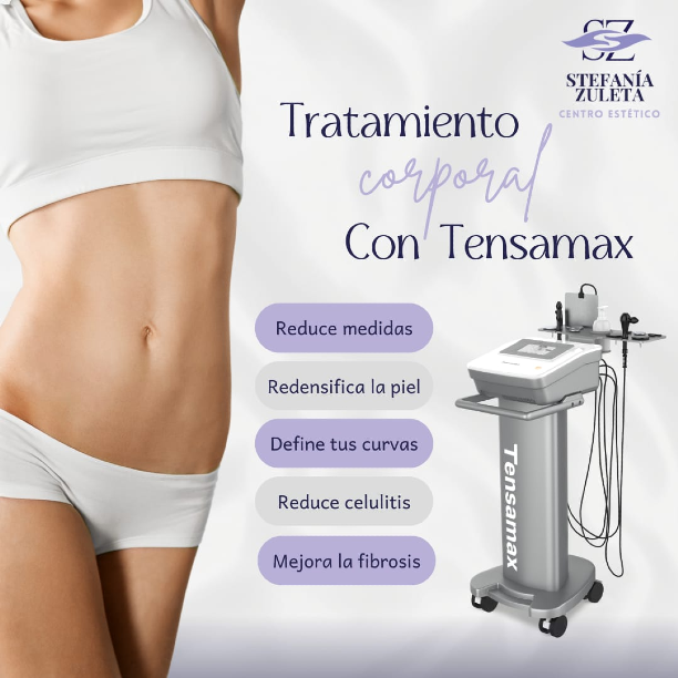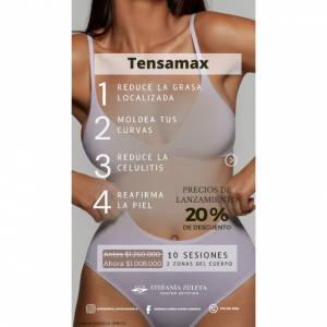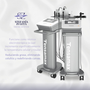 El Tensamax es nuestra tecnologia de radiofrecuencia monopolar por excelencia. Es un dispositivo con multiples funciones en procedimientos estéticos, faciales y corporales. Se recomienda incluso para post-operatorios para desinflamar y promover la regeneracion celular. - Reduce la grasa localizada - Elimina la celulitis - Moldea las curvas - Reafirma la piel - No es invasivo - Completamente indoloro - No genera incapacidad - Es relajante