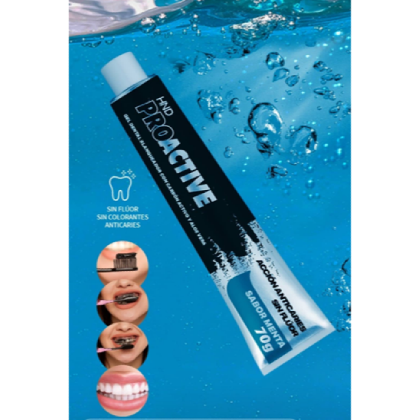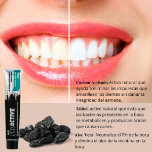 Ayuda a eliminar las impurezas que amarillean los dientes sin perjudicar la integridad del esmalte. Ayuda a la prevención de placas bacterianas y formación de caries. Mantiene el PH de la boca neutral, previniendo la desmineralización de los dientes. Prueba de eficacia clínica probada. Blanqueador. Sin fluoruro y sin colorantes