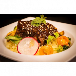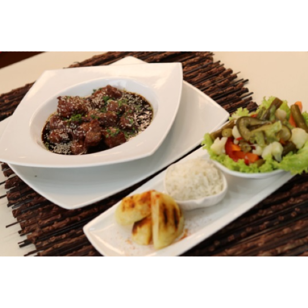 Solomo de res (madurado, corte en cuadros 250gr) al wok (con ajonjolí), acompañado con papas doradas en cascos, arroz blanco, ensalada de aguacate y tomate, con vinagreta de cilantro
