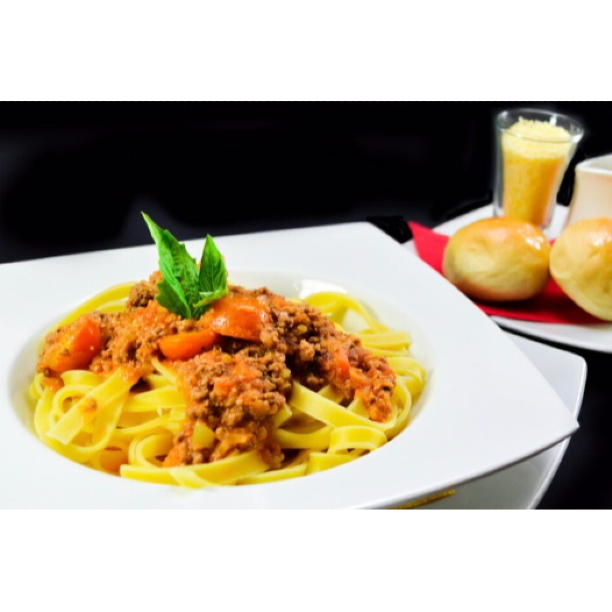 Pasta a la boloñesa, queso parmesano, aceite de oliva, acompañada con pan de la casa.