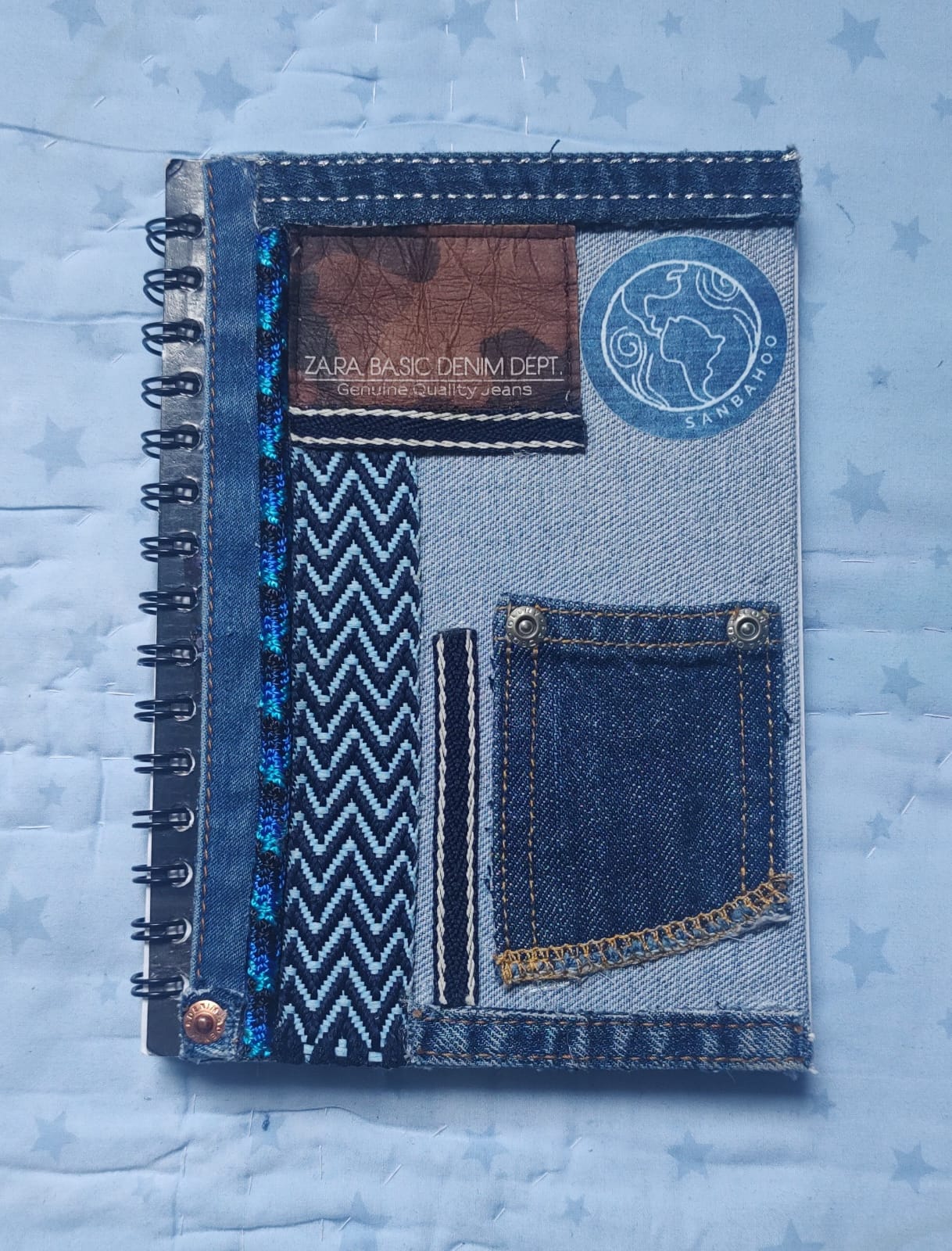 Agenda con portada forrada en denim con accesorios decorativos, 100 hojas rayada, con medidas 20cm altox15cm ancho, diseño único/moda sostenible