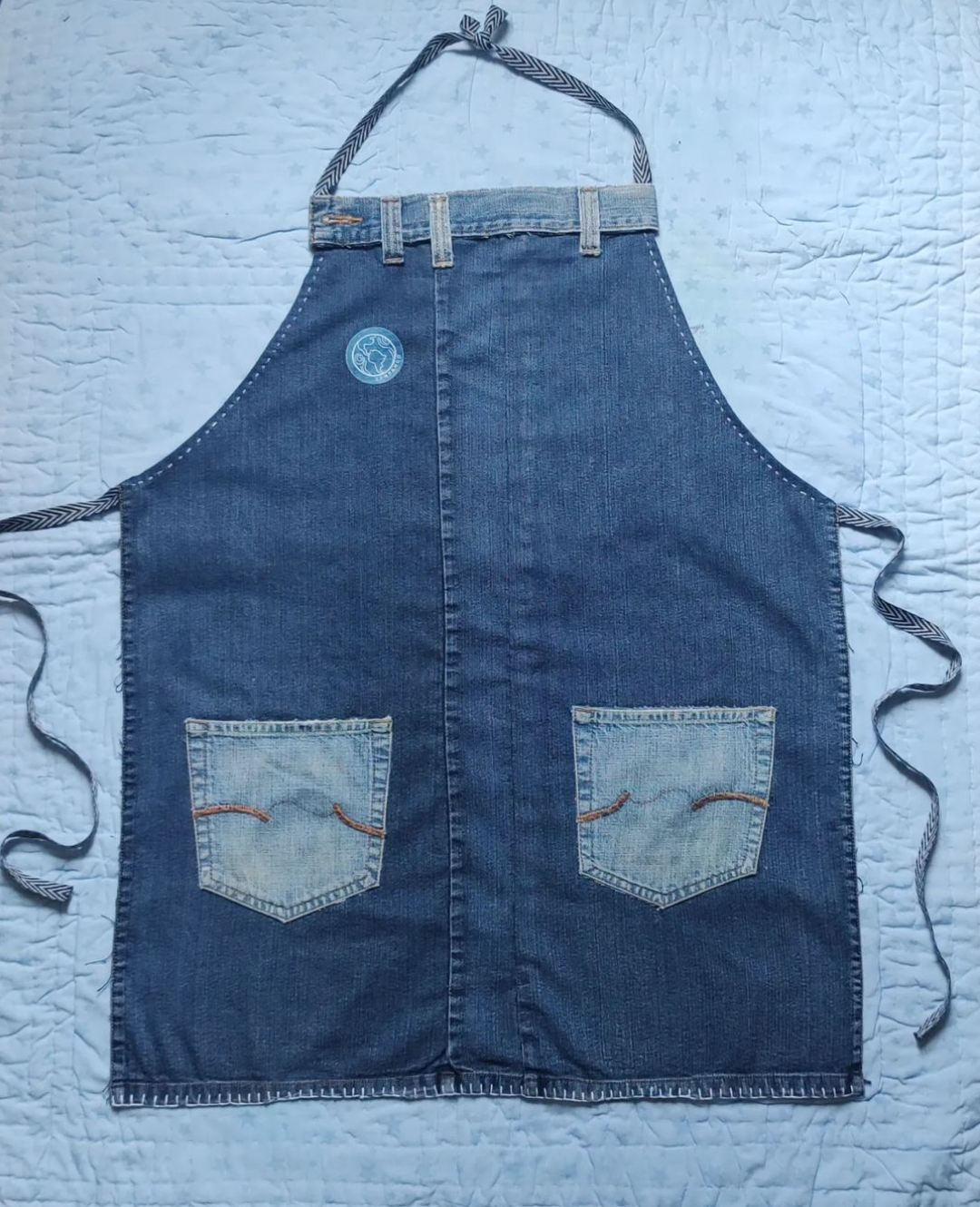 Delantal de cocina unisex hecho en jean con dos bolsillos delanteros, riata para ajuste de talla en cintura, medidas 79cm alto x 60cm ancho. Diseño único. Bolso elaborado en denim/jeans moda sostenible