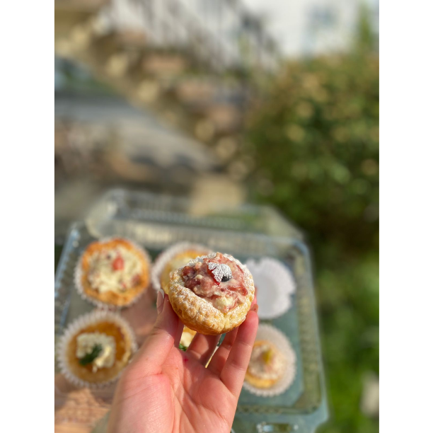 MASA QUEBRADA HORNEADA , RELLENA DE QUESO RICOTA CON HIERVAS FINAS TOCINETA Y MERMELADAS