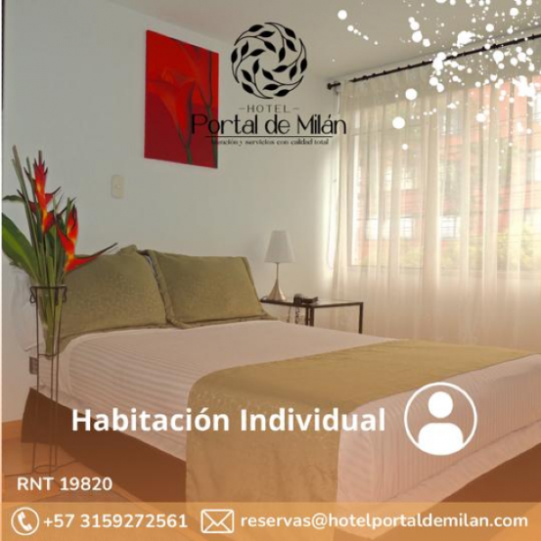 Bienvenido a Hotel Portal de Milán, su hotel en Manizales. En la tarifa otorgada podrá disfrutar de servicios como: televisión por cable, internet Wi-fi, baño privado, desayuno, parqueadero (sujeto a disponibilidad) e impuestos. Y si vienes a conocer Manizales y sus planes turísticos, desde el Hotel puedes trasladarte fácilmente a las aguas termales, a la reserva Rio Blanco, Recinto del Pensamiento, Bioma, Parque los Yarumos, Nevado del Ruiz, Nevado Santa Isabel, Circuito Cafetero, entre otros.